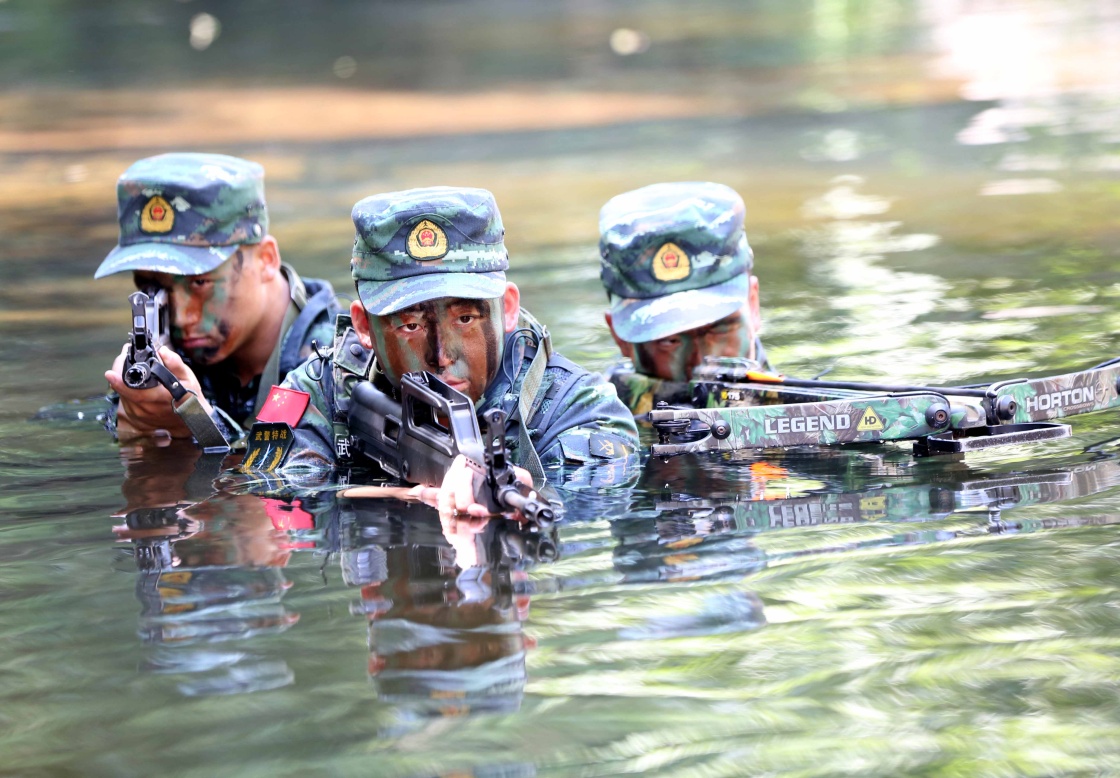 ????當(dāng)日,武警山東總隊(duì)煙臺(tái)支隊(duì)組織特戰(zhàn)狙擊手冒著34攝氏度的高溫來(lái)到昆崳山開(kāi)展叢林訓(xùn)練。狙擊手們身穿偽裝服圍繞野外生存、偽裝潛伏、極限體能等6項(xiàng)17個(gè)課目進(jìn)行綜合訓(xùn)練,在實(shí)戰(zhàn)背景下磨礪狙擊手野外生存技能和戰(zhàn)術(shù)素養(yǎng),鍛造反恐處突利刃。新華社記者 朱崢 攝