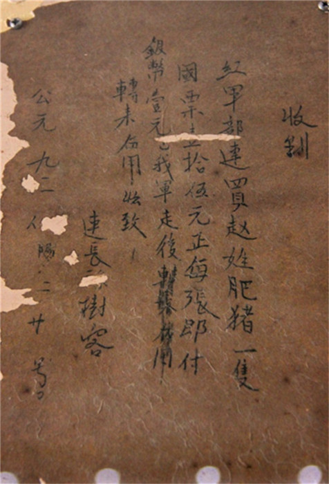 ????70多年過去,木板上的文字依稀可辨:“我們?cè)谶@塊田內(nèi)割了青稞一千斤,我們自己吃了。這塊木板可以作為我們購(gòu)買你們這些青稞的憑證,請(qǐng)你們歸來以后,拿住這塊木板,向任何紅軍部隊(duì)或蘇維埃政府,都可兌取與我們吃你們青稞價(jià)值相等的銀子、茶葉或你們所需的物品。在你們還未曾兌得這些東西之前,需要好好保存這塊木牌子”,落款是前敵總政治部。