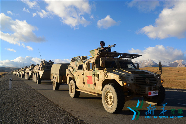 ????9月13日,我地面參演部隊(duì)采取摩托化機(jī)動(dòng)方式,于9月12日從新疆阿圖什市出發(fā),經(jīng)吐爾尕特邊境口岸出境,行程共約510公里,于9月13日抵達(dá)演習(xí)地域。新華社記者王德思 攝