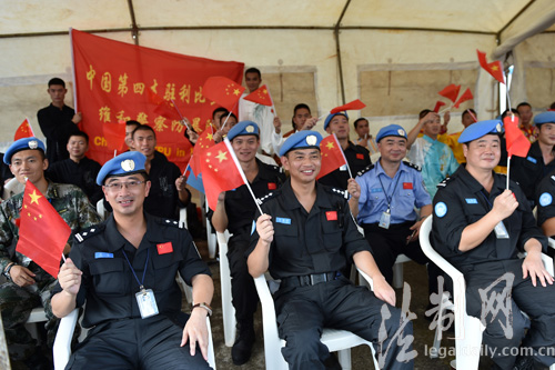 ????圖為蒙羅維亞時(shí)間10月24日,中國第四支駐利比里亞維和警察防暴隊(duì)徐曉偉政委(中)和隊(duì)員們一起為隊(duì)員們精彩表演加油 李金良攝
