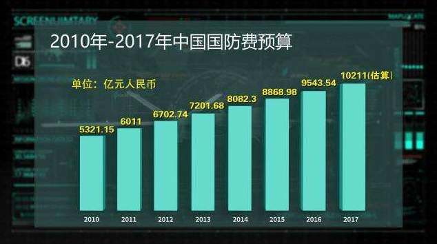 自1999年超過1000億元人民幣,到2017年突破10000億元人民幣,中國的國防實(shí)力上了一個(gè)新臺階,國防建設(shè)與經(jīng)濟(jì)建設(shè)協(xié)調(diào)發(fā)展進(jìn)入了一個(gè)新階段。