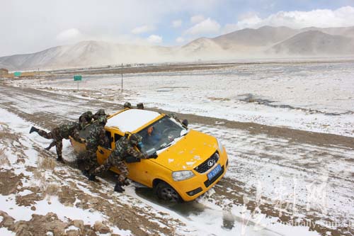 圖為西藏邊防總隊(duì)江嘎邊防派出所官兵接警后救援被困車輛