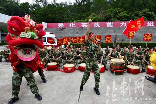 ????五月綠茵,激情無限。連日來,每到下午,深圳市銀湖山邊防訓(xùn)練基地里總是人聲鼎沸,這是廣東邊防總隊(duì)機(jī)動(dòng)支隊(duì)“和諧杯”正在如火如荼進(jìn)行。與其它足球賽不一樣的是,別的比賽屬于場(chǎng)上22個(gè)人,而這里的比賽卻屬于每一個(gè)人。這個(gè)支隊(duì)將娛樂賽事當(dāng)成放松身心、提神聚氣之舉,在系列賽事中設(shè)置與比賽同等重要的拉拉隊(duì)比賽,要求全民參與,除了場(chǎng)上比賽,裁判員同時(shí)對(duì)每支拉拉隊(duì)進(jìn)行實(shí)時(shí)評(píng)分,此舉有效的提升全民參與熱情,處處展現(xiàn)凝神聚氣爭(zhēng)第一的鮮活局面。