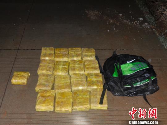 ????20時07分許,一名男子駕駛一輛無牌照摩托車冒著大雨,趁著夜色慢慢駛?cè)氩榫儸F(xiàn)場,當看到執(zhí)勤官兵示意停車檢查時,該男子在距查緝現(xiàn)場15米處調(diào)頭逃跑,掉頭過程中從摩托車上掉下一個黑色雙肩包,執(zhí)勤官兵當場從黑色雙肩包內(nèi)查獲用透明黃色蠟紙包裹的毒品可疑物17塊,凈重11.396公斤。