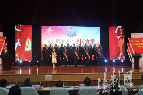圖為22名駐舟維和防暴隊隊員和報告團(tuán)成員上臺接收檢閱