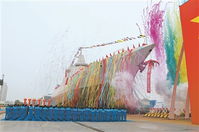 9時(shí)許,儀式開始,全體人員齊聲高唱國(guó)歌,鮮艷的五星紅旗冉冉升起。剪彩后進(jìn)行了“擲瓶禮”,一瓶香檳酒在艦艏摔碎,絢麗的彩帶從兩舷噴射而出,新型驅(qū)逐艦鳴響汽笛,全場(chǎng)響起熱烈掌聲。隨后,驅(qū)逐艦在拖曳牽引下緩緩移上浮箱后下水。