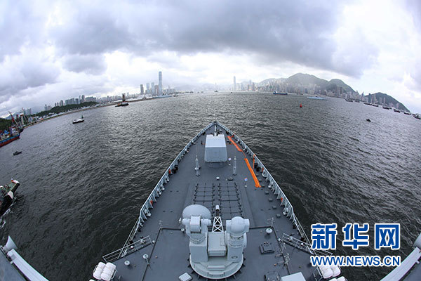 7月7日,海軍銀川艦駛?cè)胂愀郯捍薮a頭。當(dāng)日,正在執(zhí)行跨區(qū)機(jī)動(dòng)訓(xùn)練任務(wù)的中國(guó)人民解放軍海軍航母編隊(duì)抵達(dá)香港,參加香港回歸祖國(guó)暨中國(guó)人民解放軍進(jìn)駐香港20周年慶祝活動(dòng),受到香港特區(qū)政府和民眾熱烈歡迎。新華社記者 曾濤 攝
