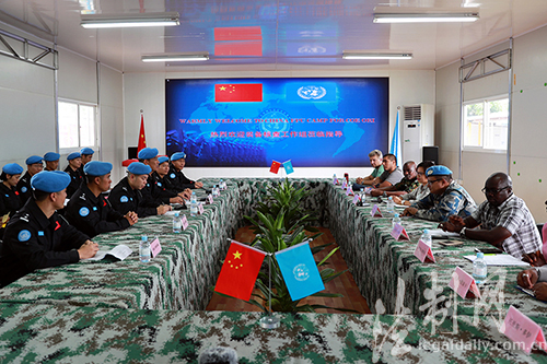 圖為中國(guó)駐利防暴隊(duì)與聯(lián)利團(tuán)裝備核查組召開會(huì)議