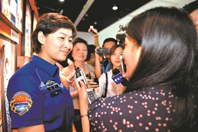 中國(guó)人民解放軍航天員大隊(duì)航天員劉洋在展覽現(xiàn)場(chǎng)接受媒體記者的采訪(fǎng)。本報(bào)記者 宋雯 攝