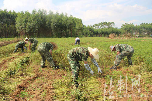 圖為貴港邊檢站官兵與農零大叔一起頂著烈日在花生田里拔花生