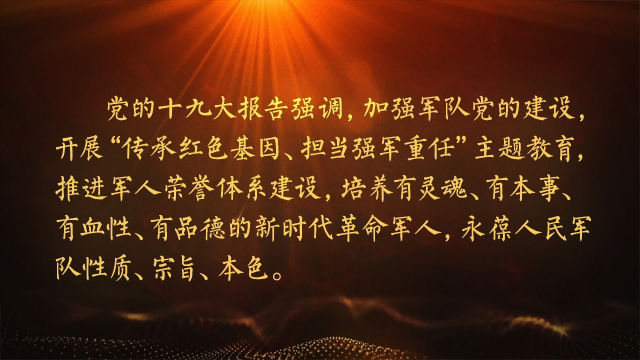 黨的十九大報告強調(diào),加強軍隊黨的建設(shè),開展“傳承紅色基因、擔(dān)當(dāng)強軍重任”主題教育,推進軍人榮譽體系建設(shè),培養(yǎng)有靈魂、有本事、有血性、有品德的新時代革命軍人,永葆人民軍隊性質(zhì)、宗旨、本色。
