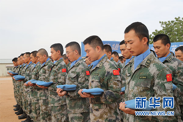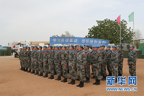 祭奠儀式上,大型機(jī)械鳴笛三聲,哀思樂曲響起,全體官兵整裝列隊(duì),集體脫帽為犧牲在維和戰(zhàn)場(chǎng)上的英烈默哀三分鐘。隨后,官兵代表致辭,追憶維和英烈們無(wú)私奉獻(xiàn)、舍生取義的光輝事跡,表達(dá)為達(dá)爾富爾地區(qū)和平建設(shè)而努力奮斗的堅(jiān)定決心。