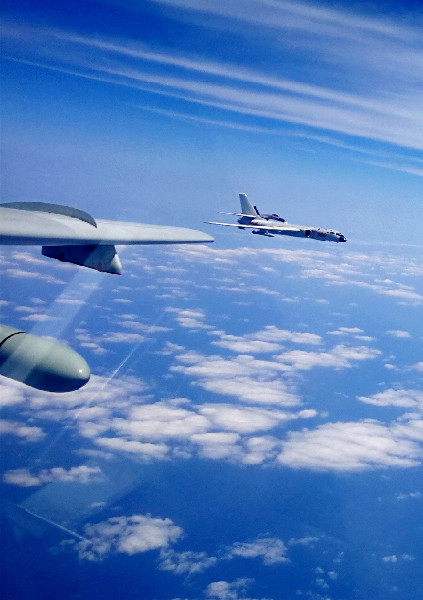 ??? 4月19日,中國(guó)空軍轟-6K等多型戰(zhàn)機(jī)執(zhí)行“繞島巡航”任務(wù)。中國(guó)空軍4月21日向海內(nèi)外發(fā)布多語(yǔ)種宣傳片《戰(zhàn)神繞島新航跡》??哲姂?zhàn)神轟-6K等戰(zhàn)機(jī)近日連續(xù)3天“繞島巡航”的震撼畫面,在宣傳片中集中展現(xiàn),彰顯了空軍飛行員維護(hù)國(guó)家主權(quán)和領(lǐng)土完整的意志能力。新華社發(fā)(王磊 攝)