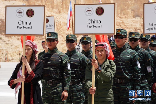 4月30日,在約旦阿卜杜拉國王特戰(zhàn)訓練中心,中國武警代表隊隊員(后)參加“勇士競賽”國際特種兵比武。新華社記者 林曉蔚 攝