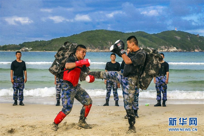 海軍陸戰(zhàn)隊某旅偵察營在三亞某海域組織特戰(zhàn)隊員進行沙灘格斗訓練(11月21日攝)。新華社發(fā)(范旭東 攝)