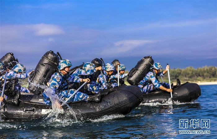 海軍陸戰(zhàn)隊某旅偵察營在三亞某海域開展劃舟訓練(11月20日攝)。新華社發(fā)(范旭東 攝)
