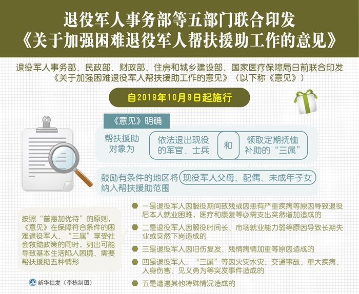 《意見》明確,幫扶援助對象為依法退出現(xiàn)役的軍官、士兵和領(lǐng)取定期撫恤補(bǔ)助的“三屬”;鼓勵有條件的地區(qū)將現(xiàn)役軍人父母、配偶、未成年子女納入幫扶援助范圍。按照“普惠加優(yōu)待”的原則,《意見》在保障符合條件的困難退役軍人、“三屬”享受社會救助政策的同時,列出可能導(dǎo)致基本生活陷入困境、需要幫扶援助五種情形:一是退役軍人因服役期間致殘或因患有嚴(yán)重疾病等原因?qū)е峦艘酆蟊救司蜆I(yè)困難,醫(yī)療和康復(fù)等必需支出突然增加造成的;二是退役軍人因服役時間長、市場就業(yè)能力弱等原因?qū)е麻L期失業(yè)或突然下崗造成的;三是退役軍人因舊傷復(fù)發(fā)、殘情病情加重等原因造成的;四是退役軍人、“三屬”等因火災(zāi)水災(zāi)、交通事故、重大疾病、人身傷害、見義勇為等突發(fā)事件造成的;五是遭遇其他特殊情況造成的。