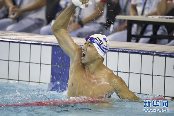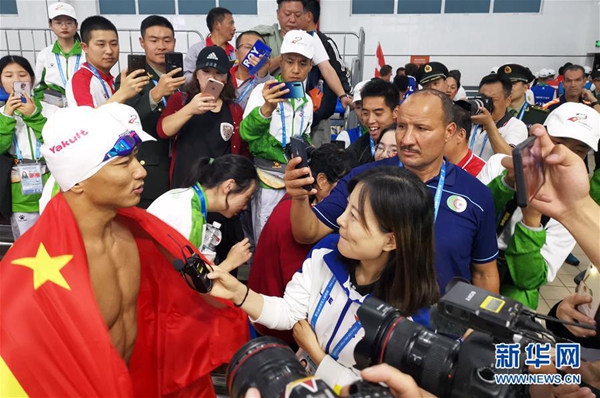 走出泳池,張政成了場上的“明星”,和幾個隊友擁抱擊掌后,便立刻被眾人圍在中間。現(xiàn)場觀眾和其他運(yùn)動員紛紛向他表示祝賀,人群中不時有人歡呼著“世界紀(jì)錄!世界紀(jì)錄!”。隨后,激動的張政披著國旗,在泳池邊跟家人、朋友合影,定格了這難忘的一刻。