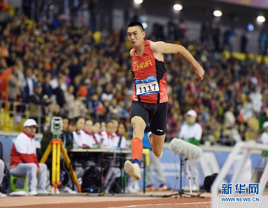 10月26日,中國選手朱亞明在比賽中。當(dāng)日,在武漢舉行的第七屆世界軍人運(yùn)動(dòng)會(huì)田徑項(xiàng)目男子三級(jí)跳遠(yuǎn)決賽中,中國選手朱亞明以17米09的成績獲得冠軍。新華社記者 范培珅 攝