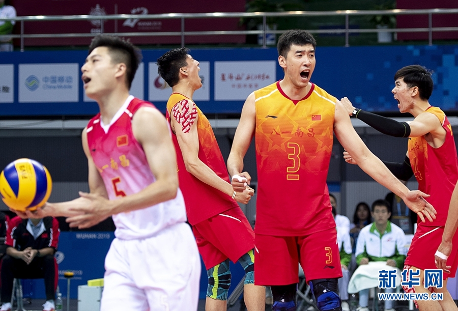 10月26日,中國隊(duì)球員在比賽中慶祝得分。當(dāng)日,在武漢舉行的第七屆世界軍人運(yùn)動(dòng)會(huì)男子排球決賽中,中國隊(duì)以3比1戰(zhàn)勝韓國隊(duì),獲得冠軍。新華社記者 熊琦 攝