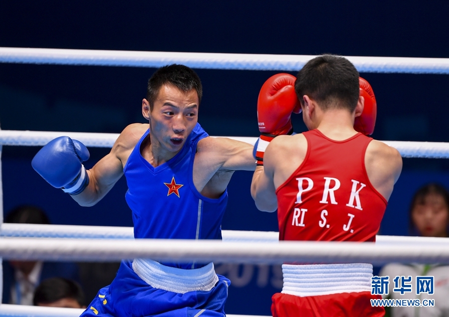 10月26日,中國選手張果(左)和朝鮮選手李承珍在比賽中。當(dāng)日,在武漢舉行的第七屆世界軍人運(yùn)動(dòng)會(huì)拳擊項(xiàng)目男子49-52公斤級(jí)決賽中,中國選手張果以5比0戰(zhàn)勝朝鮮選手李承珍,獲得冠軍。新華社記者 胡虎虎 攝