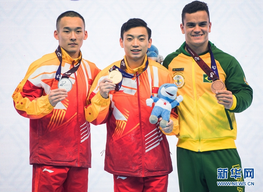 10月26日,冠軍中國選手鄒敬園(中)、亞軍中國選手肖若騰(左)和季軍巴西選手索薩在頒獎(jiǎng)儀式上。當(dāng)日,在武漢進(jìn)行的第七屆世界軍人運(yùn)動(dòng)會(huì)體操項(xiàng)目雙杠決賽中,中國選手鄒敬園以15.866分的成績獲得冠軍,中國選手肖若騰以14.833分的成績獲得亞軍。新華社記者 肖藝九 攝
