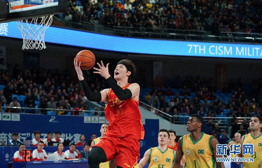 10月26日,中國隊(duì)球員王哲林(左)在比賽中上籃。當(dāng)日,在武漢舉行的第七屆世界軍人運(yùn)動(dòng)會(huì)男子籃球三、四名決賽中,中國隊(duì)以68比64戰(zhàn)勝巴西隊(duì),獲第三名。新華社記者 潘思危 攝