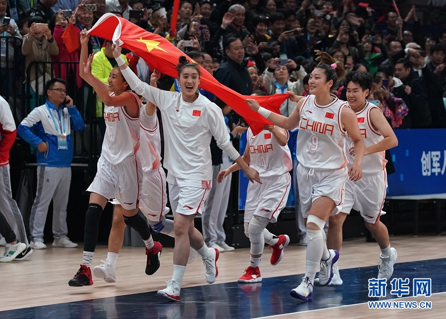 10月26日,中國隊(duì)球員在比賽后慶祝。當(dāng)日,在武漢舉行的第七屆世界軍人運(yùn)動(dòng)會(huì)女子籃球決賽中,中國隊(duì)以93比65戰(zhàn)勝巴西隊(duì),奪得冠軍。新華社記者 萬象 攝