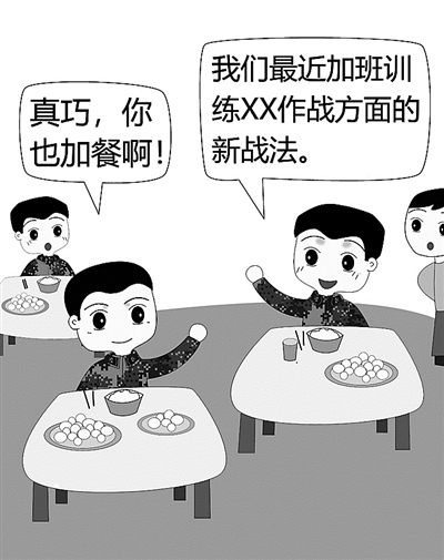 ????“真巧,你也來加餐啊?!薄笆前?,我們營最近在研訓新戰(zhàn)法,有時會加班訓練……我跟你說,我們研究的新戰(zhàn)法主要是××作戰(zhàn)方面,據說要在全旅推廣呢!”