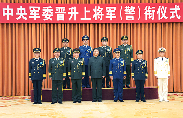 習近平向晉升上將軍銜警銜的軍官警官頒發(fā)命令狀并表示祝賀