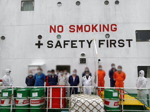 ????海警執(zhí)法員在供油母船上抓獲的嫌疑人(12月14日攝)。新華社發(fā)(敖玉洪 攝)