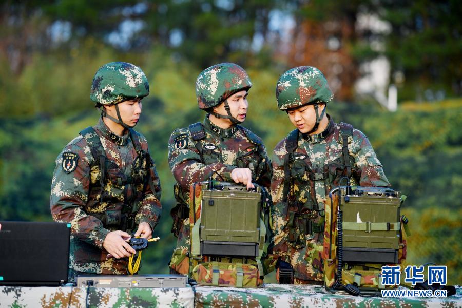 俞細文(左二)在野外訓練場迅速架設通信臺站(12月11日攝)。新華社發(fā)(劉明松 攝)