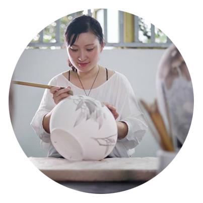 我從小就很喜歡繪畫,大學(xué)的時(shí)候認(rèn)識了我的先生,他帶我去了醴陵。當(dāng)時(shí)我看到幾個(gè)小女孩拿毛筆在瓶子上細(xì)細(xì)地勾線,我很喜歡她們這種狀態(tài),想著自己也可以嘗試一下。父親也很鼓勵(lì)我,想讓我從事這方面的工作,所以常常帶我去寫生,慢慢地我就愛上了這門技藝。我們醴陵瓷傳統(tǒng)的核心工藝是分水,父親在傳統(tǒng)工藝中總結(jié)出“薄施淡染”技法,主要表現(xiàn)對象是花卉,它能使花卉層次更加豐富、水靈通透,體現(xiàn)醴陵瓷清雅淡逸、意態(tài)高潔的陶瓷語言,所以我們現(xiàn)在的創(chuàng)作仍然以花卉為主,而這次在清華的學(xué)習(xí),讓我拓寬了許多思路,我想在山水和其他物象中嘗試去用我們工藝來表現(xiàn),希望今后能給觀者帶來一些新的感受。