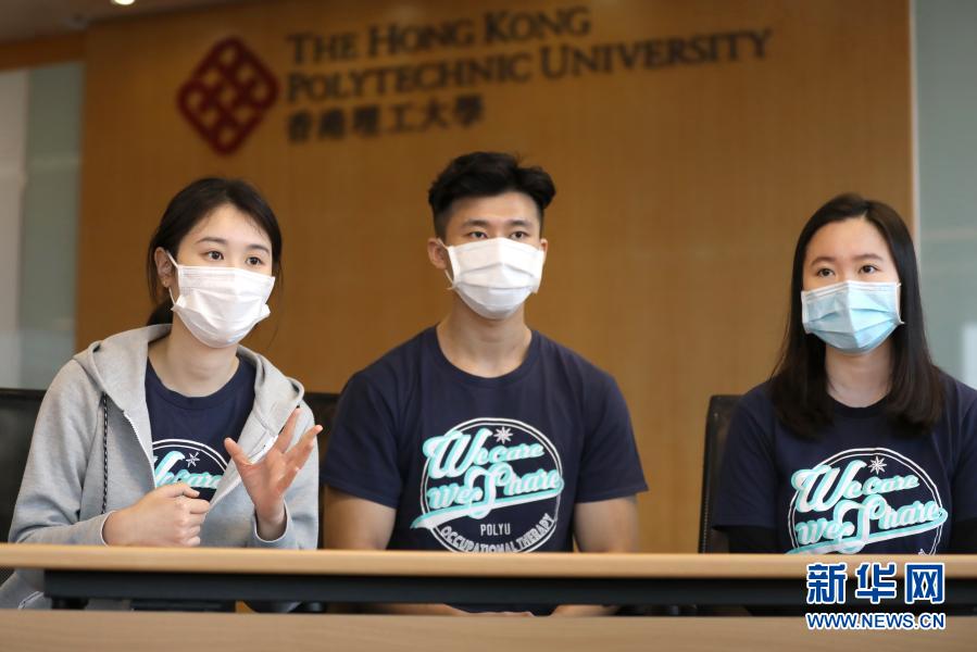 香港理大康復(fù)治療科學(xué)系職業(yè)治療學(xué)四年級(jí)學(xué)生李舒平、香港理大康復(fù)治療科學(xué)系職業(yè)治療學(xué)三年級(jí)學(xué)生李穎東、香港理大康復(fù)治療科學(xué)系職業(yè)治療學(xué)三年級(jí)學(xué)生梁熙童在接受新華社記者采訪(fǎng)(自左至右;2020年12月12日攝)。新華社記者 吳曉初 攝