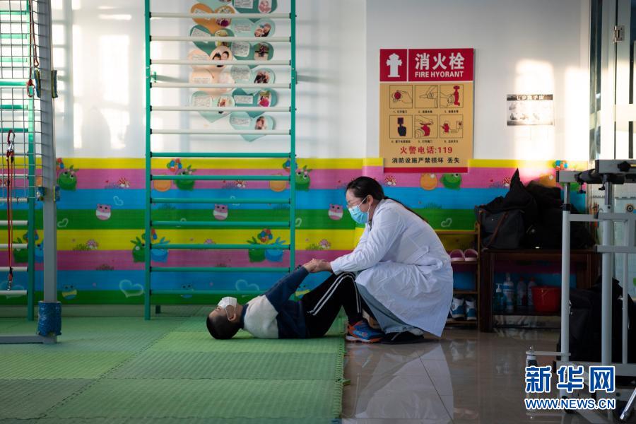 在哈爾濱博能中醫(yī)門診部,劉雨晴為腦癱兒童進行康復(fù)訓(xùn)練(2月2日攝)。