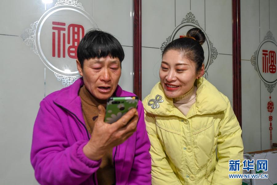 2月9日,在吉林省長春市農(nóng)安縣楊樹林鄉(xiāng)牛尾巴山村,付寶印的母親鐘士輝(左)與付寶印姐姐付寶賀用手機(jī)與付寶印視頻通話。新華社記者 張楠 攝