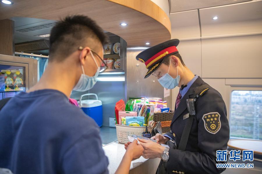 2月9日,在重慶北開(kāi)往萬(wàn)州北的C6422次列車上,付寶印為一名旅客辦理補(bǔ)票業(yè)務(wù)。新華社記者 黃偉 攝