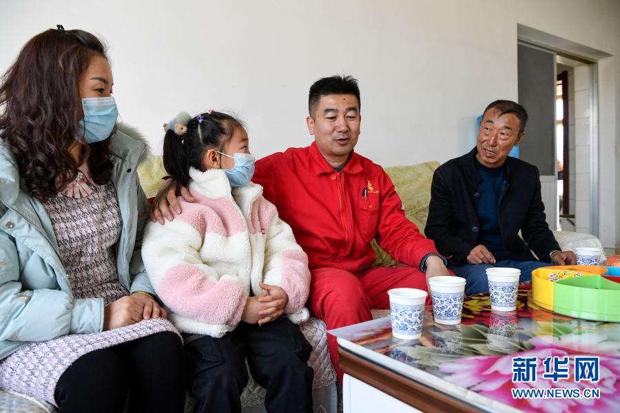 2月11日除夕當(dāng)天,王濤(右二)和妻子女兒走訪(fǎng)看望脫貧戶(hù)劉玉強(qiáng)(右一)。劉玉強(qiáng)家過(guò)去住的是土房,2017年脫貧并蓋了新房,2019年還開(kāi)起了農(nóng)家樂(lè)。