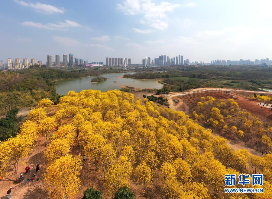 這是南寧市青秀山風(fēng)景區(qū)盛開的黃花風(fēng)鈴木(2月21日攝,無(wú)人機(jī)照片)。