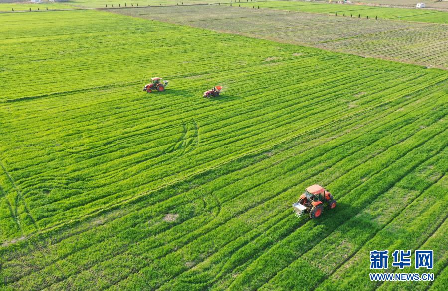2月23日,湖州錢山下糧油專業(yè)合作社工作人員駕駛農(nóng)機在田間給小麥施肥(無人機照片)。立春過后氣溫回升,浙江省湖州市吳興區(qū)道場鄉(xiāng)全力開展春耕工作。今年該鄉(xiāng)計劃播種農(nóng)作物總面積1.2萬畝,其中水稻5000畝、小麥2000畝。新華社記者 翁忻旸 攝