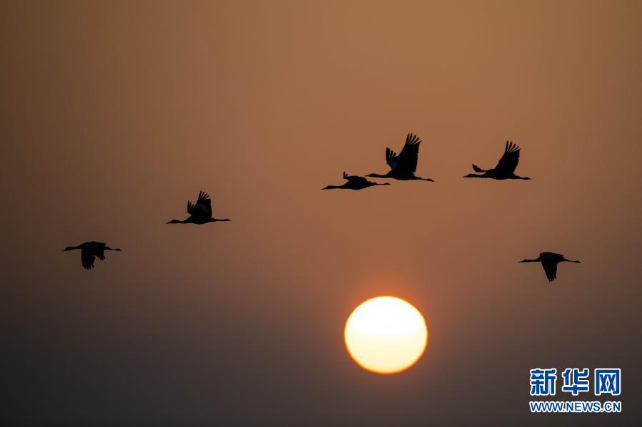 日出時(shí)分,黑頸鶴在大山包黑頸鶴國家級自然保護(hù)區(qū)飛翔(2月27日攝)。新華社記者 胡超 攝