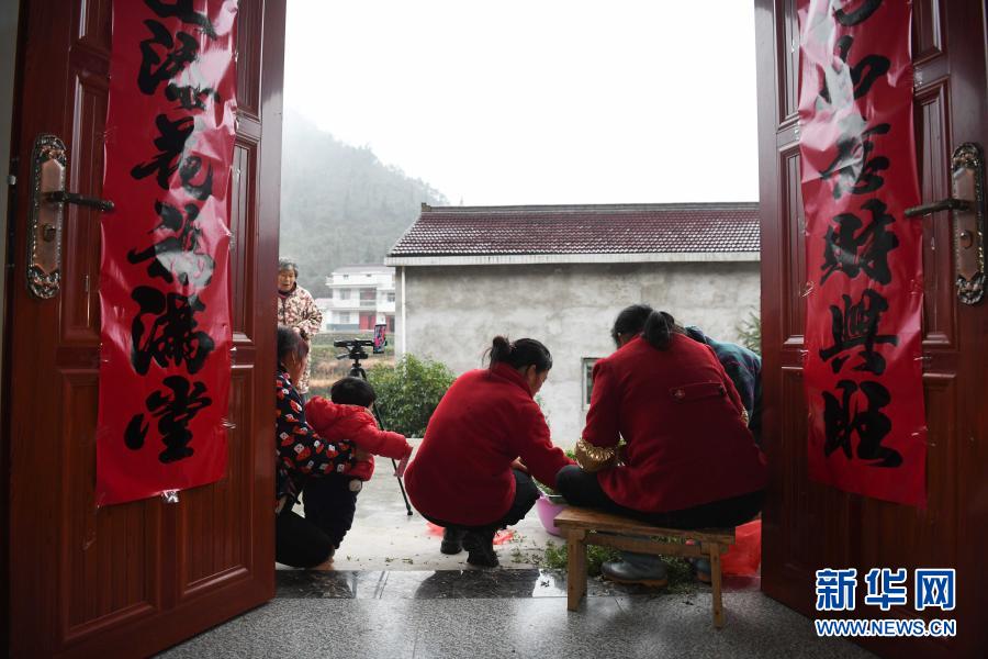 張志菊(中)在直播村民制作蒿子粑粑的過程(2月26日攝)。