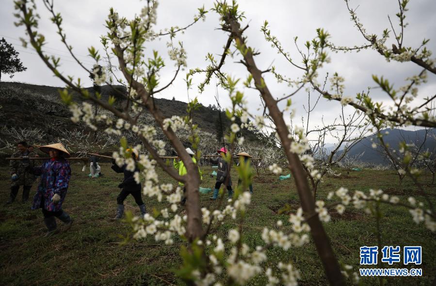 3月2日,村民在貴州省銅仁市江口縣閔孝鎮(zhèn)提紅村過江屯翠紅李種植基地進(jìn)行春管作業(yè)。新華社發(fā)(李鶴 攝)