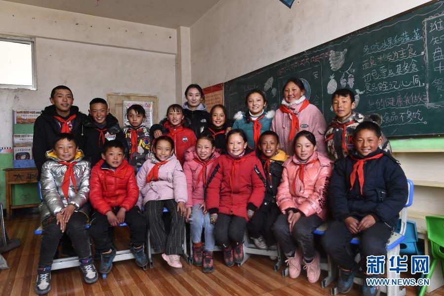 3月16日,在索加鄉(xiāng)寄宿小學(xué),查日老師(后排中)和學(xué)生在一起。新華社記者 駱曉飛 攝