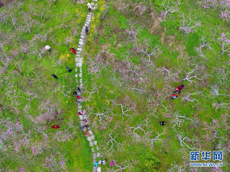 3月20日,游客在湖北襄陽襄城區(qū)尹集鄉(xiāng)的桃花嶺踏青賞花(無人機拍攝)。
