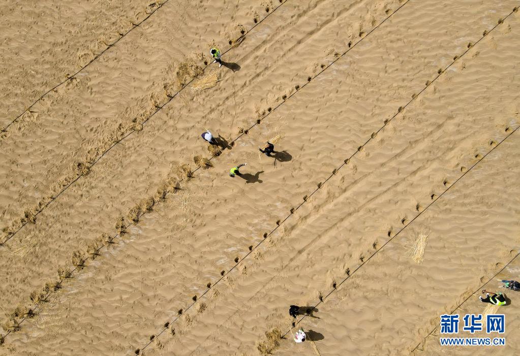 3月28日,人們在且末縣城不遠(yuǎn)處的塔克拉瑪干沙漠內(nèi)植樹(無人機(jī)照片)。
