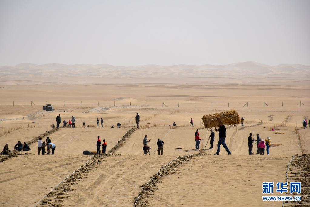 3月28日,人們?cè)谇夷┛h城不遠(yuǎn)處的塔克拉瑪干沙漠內(nèi)植樹(shù)。