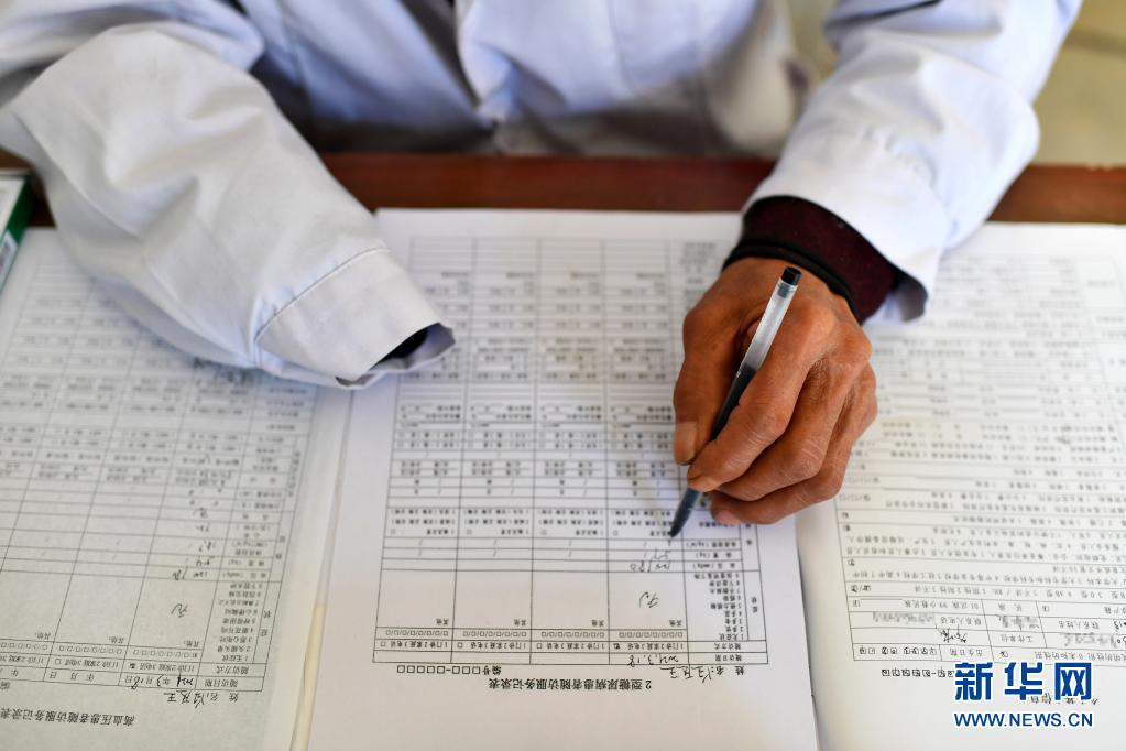 在山西省石樓縣鐵頭村衛(wèi)生室,張尚保在填寫糖尿病患者隨訪服務記錄表(3月24日攝)。新華社記者 詹彥 攝