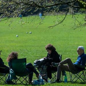 3月29日,人們在英國倫敦的報春花山享受陽光。
