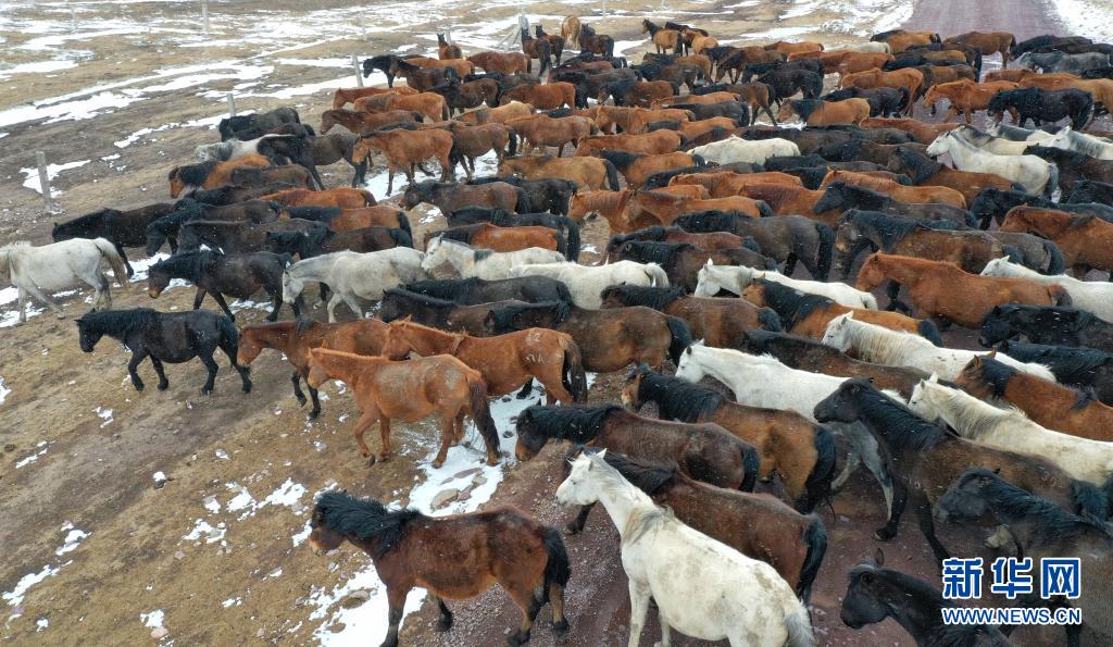 3月31日在山丹馬場(chǎng)拍攝的風(fēng)雪中的馬群(無(wú)人機(jī)照片)。